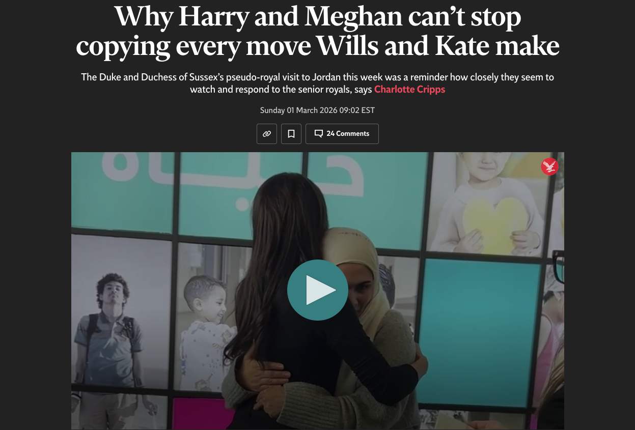今回のヨルダンについては、キャサリンのパパがブリティッシュウェイズのパイロットだったことでヨルダンに住んでいたことや、ヨルダン王室の王も皇太子もウィリアムやキャサリンはもちろんのこと、チャールズとも大変仲が良いので、ハリメガが会いたいと訴えたらしいが無視されたことなども書かれていた。