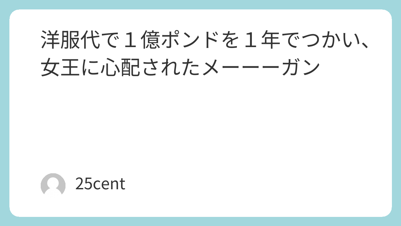 さて、今日はまた面白い話を聞きました。なんでも、ハリーとメーガンがイギリスにいた時、女王がお金の遣い方を心配していたのだそうだ。メーガンが一年で洋服代1億ポンド超えて、チャールズが心配しはじめていたのを聞いたようだ。メーガンの洋服ってそんなに素敵なわけじゃないのに、異常に高いね。一回しか着ないことにしてるそうだけど。ハリーが何もロイヤルファミリーのことを話しておかなかったから、こんな異常な女がきた。ウィリアムとキャサリン妃はどちらもメーガンと結婚するのが早すぎると思っていたそうだが、やっぱりその通りだった。エジンバラ公が、はじめてキャサリン妃が宮殿に来た時、「ウィリアムは素晴らしい女性を見つけた」と言っていたと彼の友達が話していた。「ここまでロイヤルファミリーが何をしなければいけないかわかっている女性を見つけてくるとは」と驚いていたそうだ。その時はダイアナと比べてたらしい。「自分が自分がって前に出ていくダイアナとは違う」とも言っていたという話だった。メーーーーガンはもっとすごいね。この間発表したアニメ「パール」の話を報じた報道機関が、「ミーミーミーばかり言っていた」と思い切り皮肉を書いていた。ハリーは、「メーガンの欲しいものはすべて手に入れる」と言っていたが、働いたこともないのにどうするつもりなのか。女王に反対されるとそれ以上押しきれなかったみたいだけど、どうなのよ?前にも書いたけど、王室を離れてから物凄い勢いでお金をつかっているそうで、半年でダイアナの遺産やエジンバラ公の遺産の半分はもうないらしい。数十億つかったってことだよね?それで今仕事をしようとしているそうだが、毎年6億かかるのに、そんなにハリーは稼ぐことができるのだろうか。前にメーガンが自己破産したときのように、ハリーが自己破産するような気がしている。そういう場合、ハリーの家族は返さなきゃならないのかね?これって日本の皇室も他人の話じゃないよね。MさまがKさんと結婚して、借金地獄になった場合、皇室が返すのか?そういう心配のある人とは結婚させてはいけない。ハリーみたいになるよ。そういえば今月ニューヨークの弁護士試験があると言っていたが、合格したの?したんならあまり心配しなくてもいいかもしれないけど、あるだけ使う人みたいだからどうなんだろうね。落ちてたらもう何もいうことはないからさっさと別れてもらおう。
